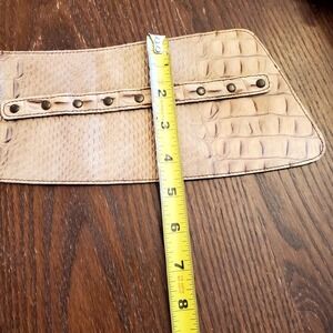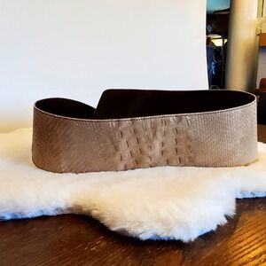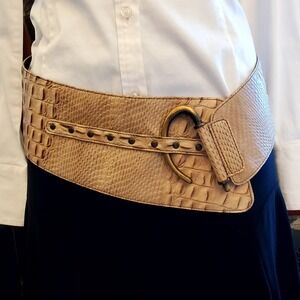 Vintage Topaz wide leather belt made in Italy. Genuine leather with an elegant embossed reptile pattern in a neutral beige/tan tone. Features a dark brown leather lining, antique brass-tone D-ring buckle, and adjustable rivet-style holes. A bold statement belt perfect over dresses, tunics, or coats. Approx. 3.5"- 5" wide at the center. Very good vintage condition with light wear consistent with age. See photos for details and measurements.