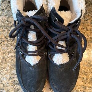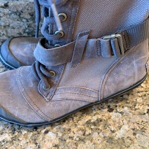 Sorel slimboot lace boots. These are a size 8 and the colors brown and tan. They are leather and canvas with lace up closure. Overall good condition.