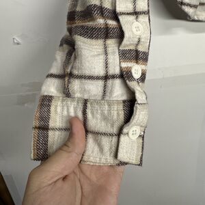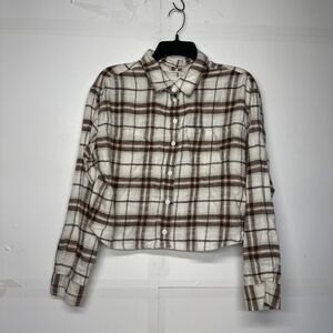 This American Eagle cropped top for women in size S is a beige cotton collared long sleeve casual top with a button closure. Made of lightweight cotton material, this stylish top features a plaid pattern and a regular fit. Perfect for the summer, fall, and spring seasons, this top has a colorful and classic theme. With its casual style and comfortable features, it is a versatile addition to any woman's wardrobe. The pit to pit is 20 inches and the shoulder length down is 20 inches and the sleeve length is 22 inches