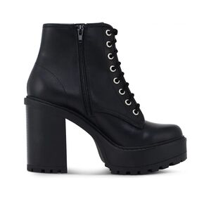 Edgy, military-inspired combat booties designed with a bold platform and chunky block heel. Crafted from smooth premium vegan faux leather, these boots combine style, comfort, and stability with a rugged lug sole and easy on-and-off design.