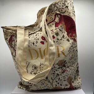 Dior tote with intricate floral pattern. Features bold red and gold details.
