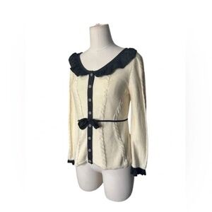 Anthropologie Guinevere angora silk cardigan in ivory cream with a black ruffled collar, black trim, and a black ribbon tie waist.