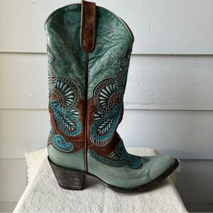Elegant turquoise boots with intricate embroidery. Perfect for a stylish western look.