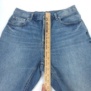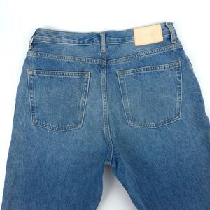 Straight fit. Cropped at the ankle. Sits at high waist. Rise: 11”. Leg opening: 14” (size 28).