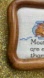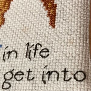 Charming cat embroidery art in a wooden frame. Features a playful cat design with a humorous quote. Some staining near the cat’s tail. Kitschy and cute.