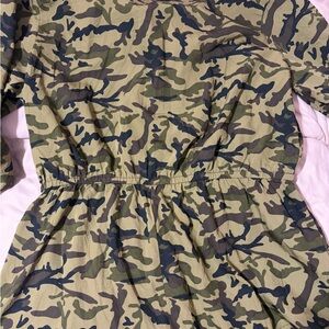 Stylish camouflage blouse with a zip-up front. Perfect for casual outings. Features a comfortable fit and trendy design. stretch at the waist