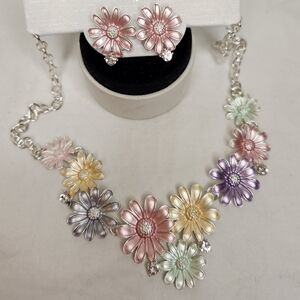 Pretty Pastel green yellow pink & purple Daisy Silver Chain choker Necklace with matching stud Rhinestone Earrings. Lightweight, Adjustable chain up to 10", Costume Jewelry, NWT.
