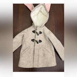Made from 100% wool and fully lined with soft faux sherpa, itâs designed to keep kids warm, cozy, and comfortable while looking absolutely adorable. The oatmeal wool exterior is paired with sweet blush pink hoodie with bunny ears, classic toggle closures, and handy pockets for tiny treasures.