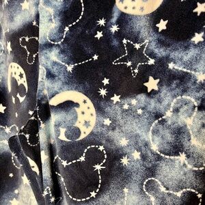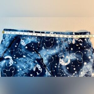Disney pajama bottoms featuring a celestial-themed pattern with Mickey Mouse silhouettes, stars, and moons.