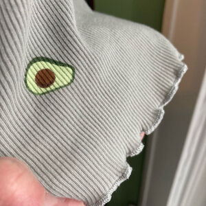This is a pre-owned H&M t-shirt, size S. The shirt is light green and features an all-over avocado print. It has a ribbed texture and a crew neckline. The sleeves and hem have a lettuce edge finish. The material appears to be a cotton blend. There are no immediately visible stains, tears, or other significant imperfections.