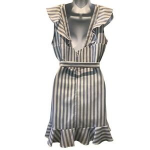 SHE + SKY blue and white stripe sleeveless chambray dress. Size L. New Without Tag. Ruffle detail on the shoulders, front and along the hemline. Square cutout back. Invisible zipper. Removable sash tie. Lined.