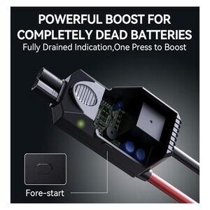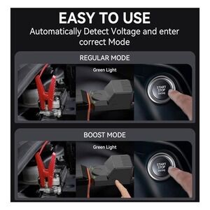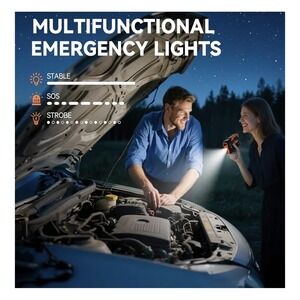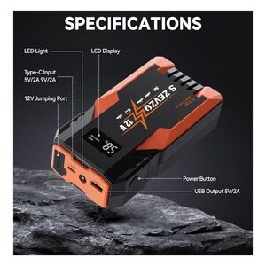 Features: Built-in LCD display showing remaining battery percentage and output status, 12V jumping port with smart jumper clamps, multifunction LED flashlight with steady, SOS and strobe modes.