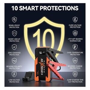 Safety: 10 smart protections including spark-proof, short-circuit, reverse-polarity, reverse-charge, low-voltage, over-voltage, over-temperature, and jump-starter timeout protection; designed to operate from about -4°F to 140°F.