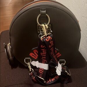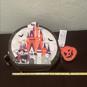 Round backpack featuring a Disney castle design with bats and a character. Perfect for theme park visits.