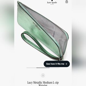Stylish metallic green wristlet by Kate Spade. Perfect for adding a pop of color. Bought brand new and never used from a smoke free, dog loving home. Measurements 4.5" x 8".