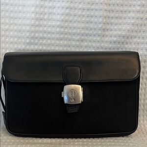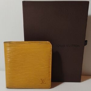 Elegant red Louis Vuitton wallet. Features iconic monogram design. Shiny finish with silver button closure.