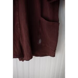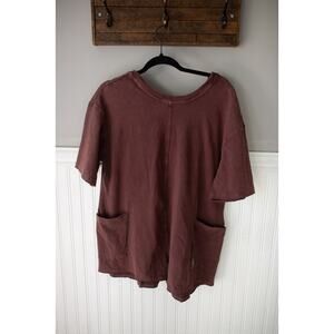 Features: Soft fabrication with a stretchy feel, scoop neckline, ribbed trim, patch pocket detail at front, V-shaped back, dropped sleeves, raw hemlines