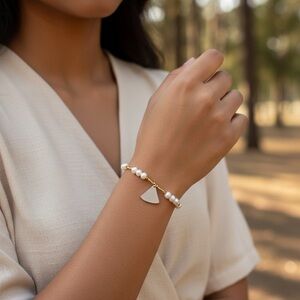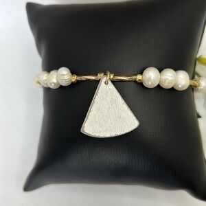 Handmade Distressed Wood/Freshwater Pearl/Gold Tone Bracelet Length-8”