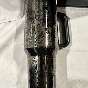 Stylish Stanley tumbler with intricate silver design. Durable handle for easy grip.
