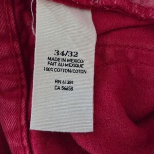 Rugged and stylish jeans from Denim & Supply Ralph Lauren. These slim-fit jeans come in a unique red color and feature distressed detailing throughout, adding a touch of edgy style. The jeans also have a classic five-pocket design, button fly, and signature brand patch on the back. Perfect for casual outings, concerts, or weekend adventures. Size 34 x 32, measurements lying flat waist 18", rise 11", and inseam 29", Note a tiny beach mark at the bottom of the right pant leg, but not very noticeable and goes with distressed vibe, otherwise in great condition.