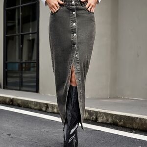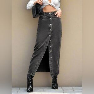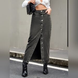 Elevate your style with this chic denim maxi skirt. Featuring a stylish front slit and button details, it's perfect for any occasion. The classic black color adds a touch of elegance to your wardrobe.