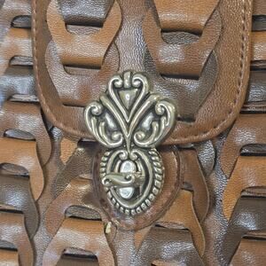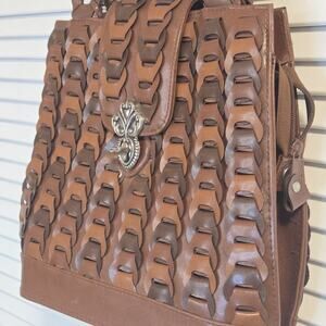 Braided Quality Leather Shoulder Bag Cognac Brown Retro Brushed Silver Closure