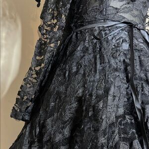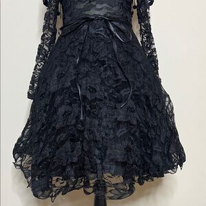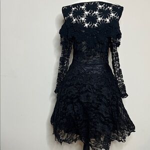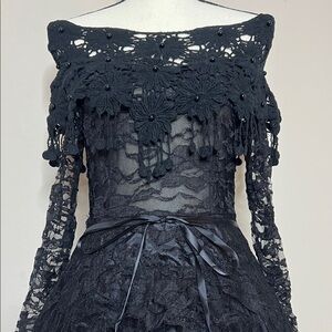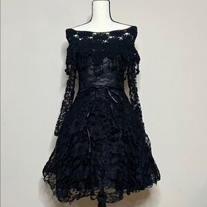 Step into elegance with this stunning black lace off-shoulder dress. Perfect for any special occasion, its intricate lace design and flattering silhouette make it a must-have. Zipper openings on the side. With petticoat-like inner attached innerskirt to make the dress puffy looking. Vintage style. Unique.