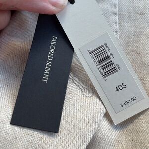 Quality linen-cotton jacket perfect for the warmer weather. Can be worn as a blazer or a suit jacket. It has a tailored slim fit with two inside pockets. New in excellent condition. Inner tag has a mark to prevent store return.