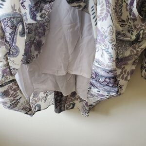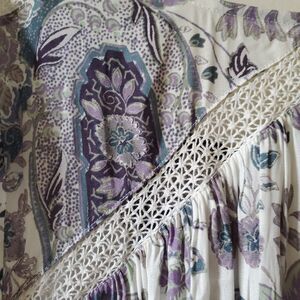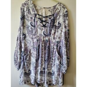 Tie is a replacement. Great condition. No rips, stains or odors. Add a touch of bohemian elegance to your wardrobe with this Free People Rain Or Shine Lace Up Mini Dress in ivory paisley. The V-neckline and balloon sleeves create a flattering silhouette, while the lace-up closure adds a unique detail. The dress is made of polyester and should be hand washed only for best care. It comes in size XS and is ideal for any occasion from casual to dressy. The A-line style and mini length make it versatile and easy to wear with any type of shoes. Get ready to turn heads in this stunning purple dress.
