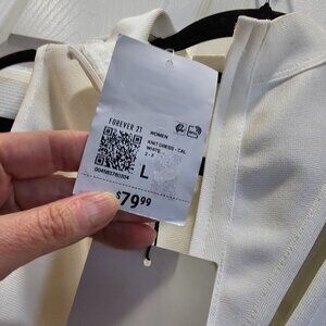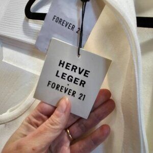🤍 Sleek and sculptural—this Hervé Léger for Forever 21 collaboration piece delivers designer-inspired drama in a crisp white palette. Featuring a fitted silhouette, sleeveless cut, and bold cutout detailing across the bodice, it’s a standout choice for parties, date nights, or fashion-forward events. The textured knit fabric hugs curves while the vertical seam elongates the figure.