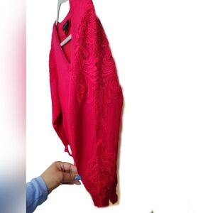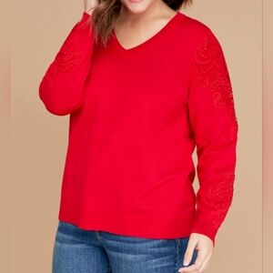 Bright Red V-neck sweater with Lace sleeve detailing. Perfect for adding a pop of color.