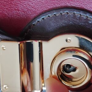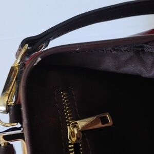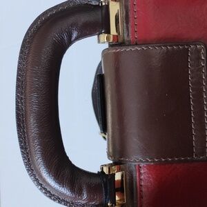 This elegant Diviana Firenze handbag features a rich brown and red leather design, perfect for any occasion. The gold-tone hardware adds a touch of sophistication. Ideal for the modern woman. A little peel by the corner inside the bag. Great, new condition.