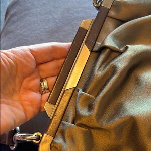 Before the cross over bag was a thing, this Marni bag introduced just the right mix of chic meets practical. Even in fabrication, the bag is an army green silk, with army straps with leather and metal hardware. A call out: back of bag can use a little restitch. See pic. Lots of life and in great condition.