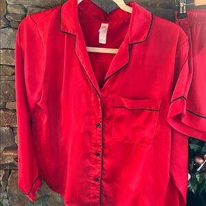 Luxurious red satin pajama set featuring black trim by Stars Above. Includes a long-sleeve top and shorts. Size Extra Small; New Without Tags and never worn!
