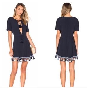TULAROSA TULLULAH mini Navy dress with tassels on the hem featires