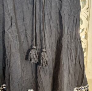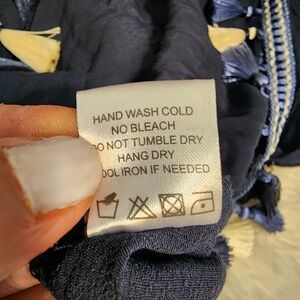 Bottom hem is ornamented with embroidered trim and stunning satiny tassels in navy, light blue and white.