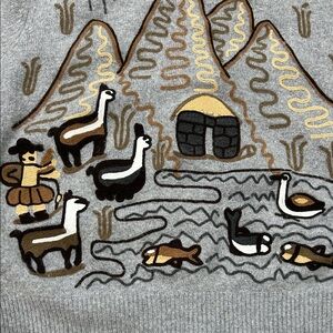 Stylish gray sweater with intricate brown and gold patterns. Features unique design elements. 100% Cashmere.
