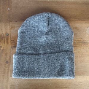 Gray knit beanie with purple and white stitching. Ideal for everyday wear.