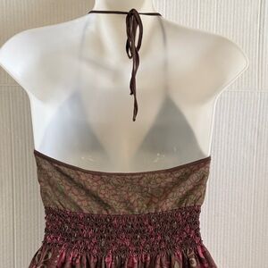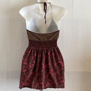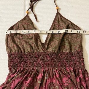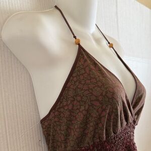 Style features: V neckline, halter tie straps, smocked waist, empire waist, babydoll silhouette, brown pink green floral print