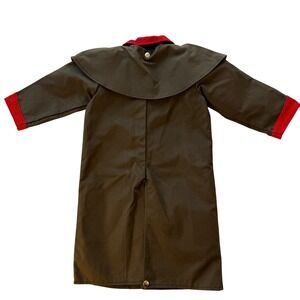 Keywords: duster coat, western style, cowboy coat, rodeo, red accents, button front, long sleeve, kids outerwear, costume, play clothes, themed party, fall fashion, corduroy collar, snap closures