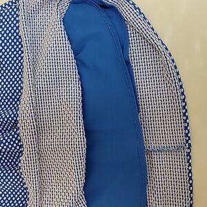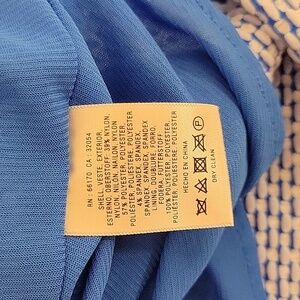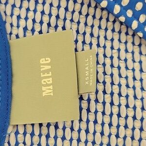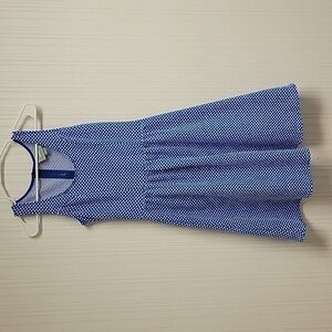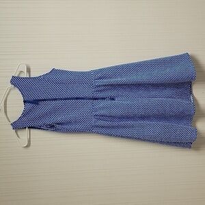 Maeve women's xsmall sleeveless blue and white polka dot fit and flare dress. back zip, fitted top, fully lined skirt. nylon, polyester, spandex blend. 33" chest, 26" waist. knee length (D2-025)