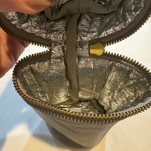 Stylish gray leather bottle holder by FAWN. Features a convenient zipper closure.