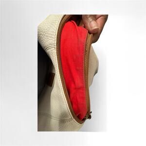 Dooney & Bourke - Cream White Leather Hobo Shoulder Bag w/ Dust Bag. In excellent pre-owned condition. Measures approximately 11” wide x 6” tall x 3” deep. Interior is red lining, very clean. There are scuffs on the corners of the bag. See pictures for call outs