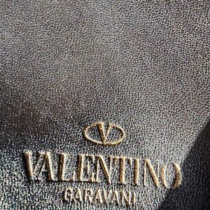 This is a black vintage satchel style,Structured shape, briefcase style, leather Valentino Garavani handbag with gold accents.
