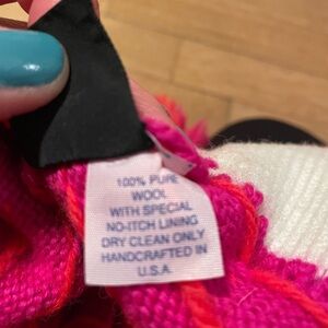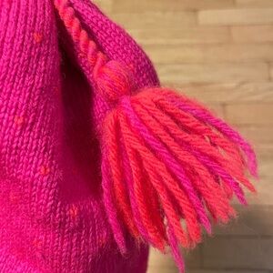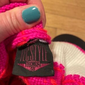 Bright and cozy Tecnica hat. Features bold pink and orange design. Perfect for chilly days. Vintage, handcrafted, 100% wool. Great shape, no shrinkage or stains, some discoloration on inside lining (forehead), no stinky scent. All items from a dog friendly, smoke free home and ship next biz day.