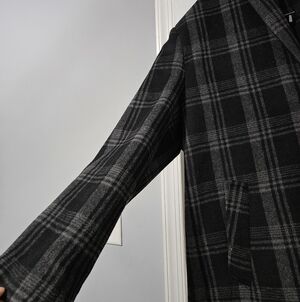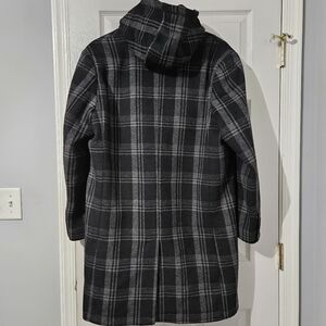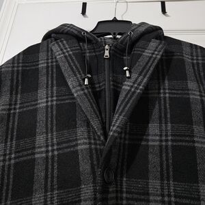 Stay stylish and warm with this black and gray plaid coat. Perfect for any occasion, this coat offers both comfort and elegance. Could be worn 2 ways - with/without vest and hood.