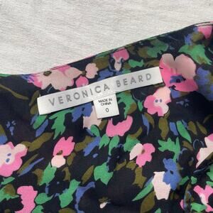 Veronica Beard Naomi floral dress, size 0. Features a v-neckline, long sleeves, and ruffled details. Good preowned condition. The right arm cuff has one button that is loose.