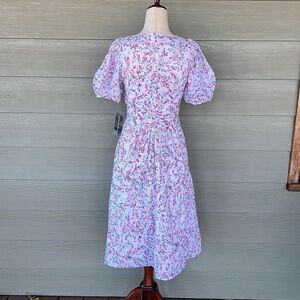 Pretty puff sleeves frame this lovely printed frock finished with handy pockets and a perfectly flared skirt.