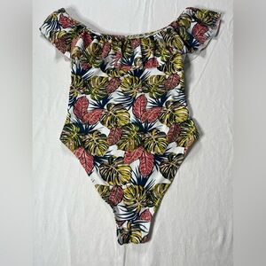 Embrace the tropics with this stylish one piece swimsuit, featuring a vibrant leaf print in pink, yellow, and green. Perfect for a sunny beach day. Bra liners removed and light staining on inside fabric- see picture.