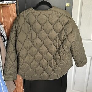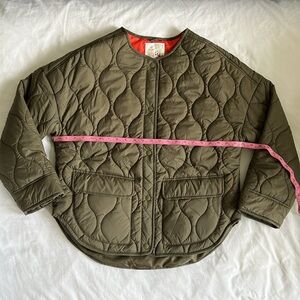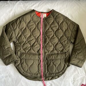 Quilted olive bomber jacket. Features orange lining. Snap button closure. Two front pockets.